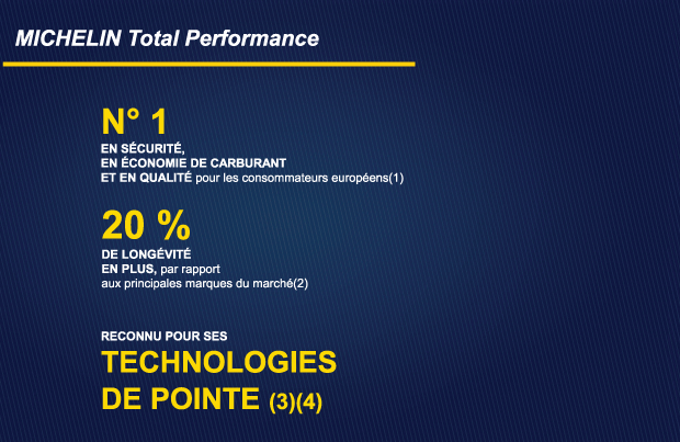 Tests TÜV SÜD 2009 -2011, DEKRA 2009-2013, et AutoBild 2011-2013. (3) N°1 en innovation pour les consommateurs. Etude TNS Sofres 2012 réalisée dans les 5 principaux marchés européens auprès de plus de 9 000 consommateurs. (4) Michelin partenaire co-développeur de référence de Porsche.